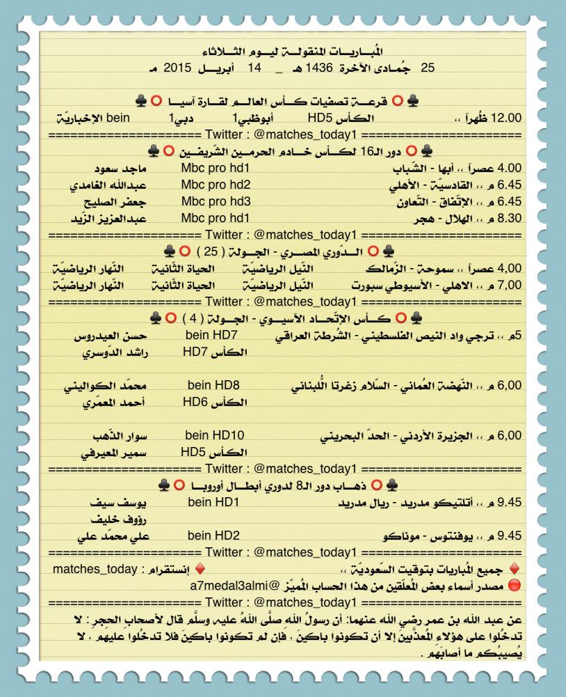 مباريات اليوم الثلاثاء 25 جمادى الآخرة/ 14 أبريل